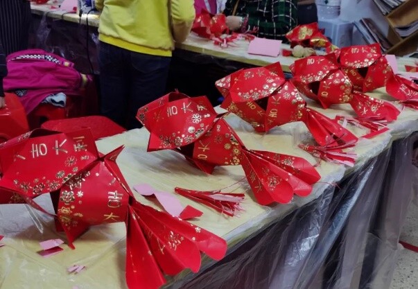 近一個小時的制作,一盞盞喜慶的紅包魚燈籠就完成了,年味十足,活動現場充滿歡聲笑語。大家看到經過自己一番努力制作出來的成品時,臉上都有說不出的喜悅和成就感。
