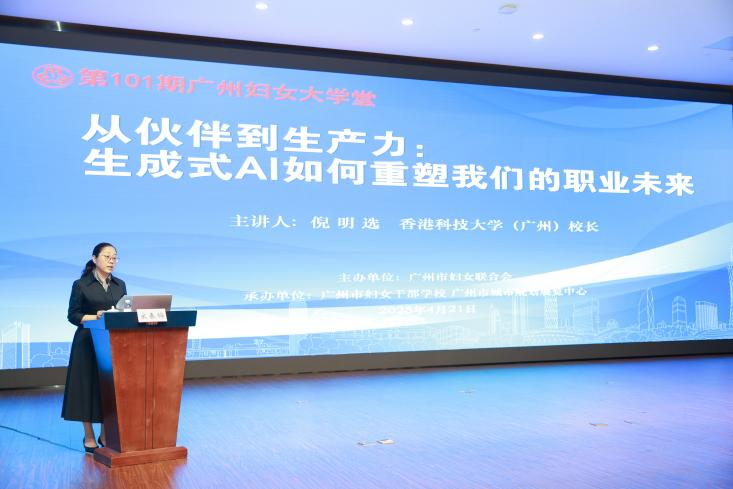 為深入學(xué)習(xí)貫徹習(xí)近平總書記關(guān)于人工智能的重要論述和黨的二十屆三中全會(huì)精神,不斷提升婦聯(lián)干部對(duì)前沿科技的認(rèn)知水平和實(shí)踐能力,在深化巾幗科技創(chuàng)新行動(dòng)中為廣州高質(zhì)量發(fā)展貢獻(xiàn)巾幗力量,4月21日下午,由廣州市婦聯(lián)主辦的第101期廣州婦女大學(xué)堂在市城市規(guī)劃展覽中心成功舉辦。本次活動(dòng)特邀香港科技大學(xué)(廣州)創(chuàng)校校長(zhǎng)倪明選教授作專題輔導(dǎo),吸引了各區(qū)和鎮(zhèn)(街)婦聯(lián)干部、婦聯(lián)執(zhí)委,市直單位婦工委、婦委會(huì)婦女干部及各界婦女代表,市婦聯(lián)機(jī)關(guān)、直屬事業(yè)單位全體黨員干部等300多人齊聚一堂,共同探索人工智能時(shí)代“她”的無(wú)限可能。市婦聯(lián)黨組成員、副主席宋春梅主持專題輔導(dǎo)會(huì)。